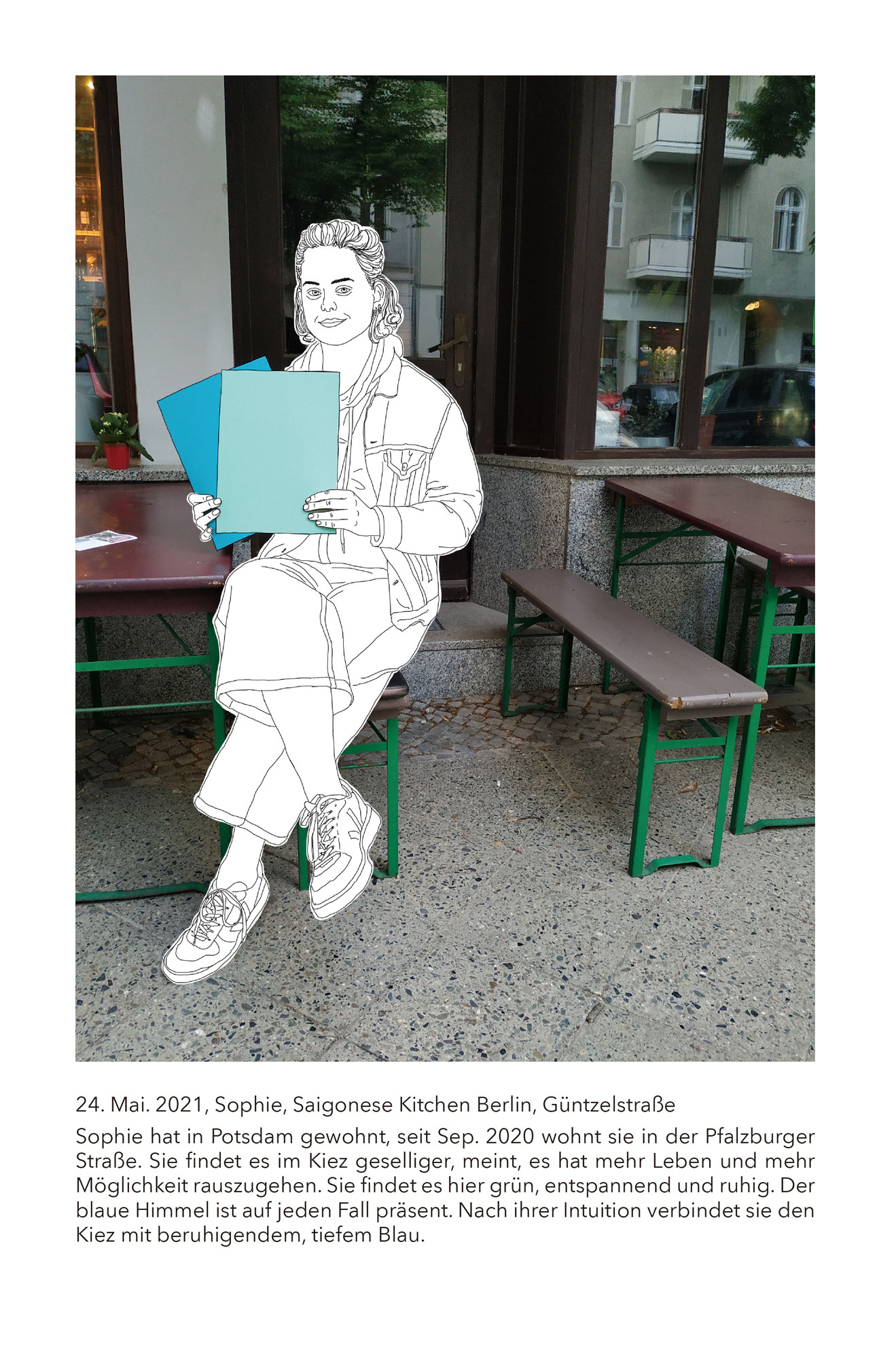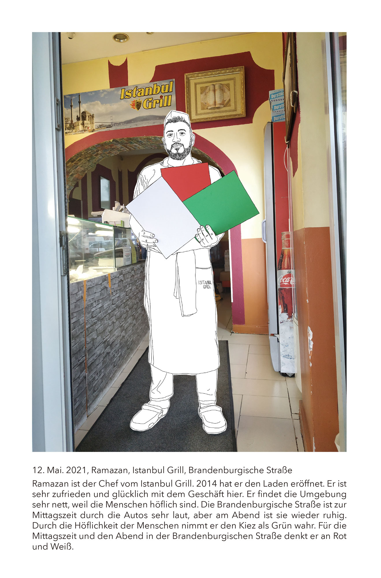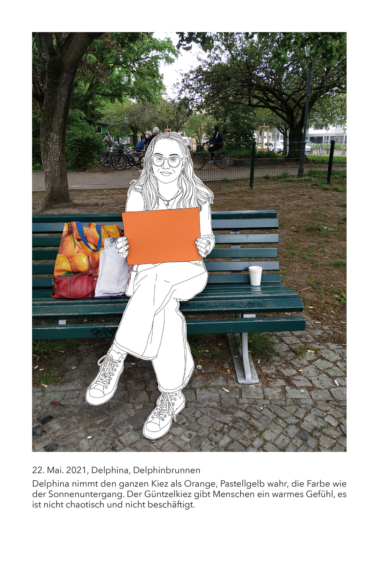 I’ve been in Güntzelkiez for a month and a half. I got to know nice tea shops and delicious restaurants and snack bars. I met a lot of people and we talked about the perceptions of the Güntzelkiez. During that time I spoke to over 130 people, 116 of whom took part in my project. A total of 194 color perceptions were collected. Of the color perceptions, green was mentioned most frequently – 54 times, and then yellow – 31 times, blue – 27 times, orange – 20 times, red – 17 times, pink – 9 times, gray – 8 times and so on. In total, the residents mentioned 15 different color categories.
